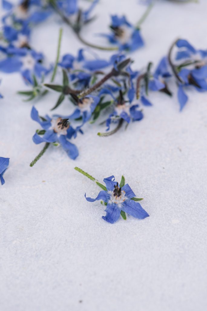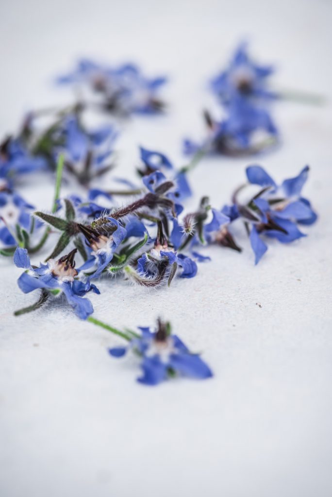 Borage is eaten fresh as a vegetable or dried as an herb. Borage tastes like cucumber and is eaten in salads or as a side dish. Its flowers, which contain the non-toxic alkaloid thesinine, have a sweet taste and are one of the few edible blue flowers.